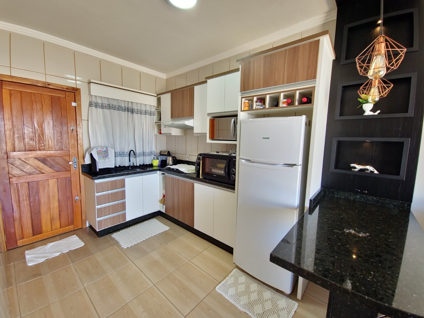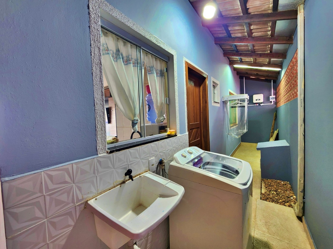 Sala ampla e cozinha integrada, 02 dormitórios sendo 01 suíte, banheiro social, área de serviço coberta, ampla área de festas com fogão a lenha, churrasqueira a carvão e bancada com vaga de garagem coberta.