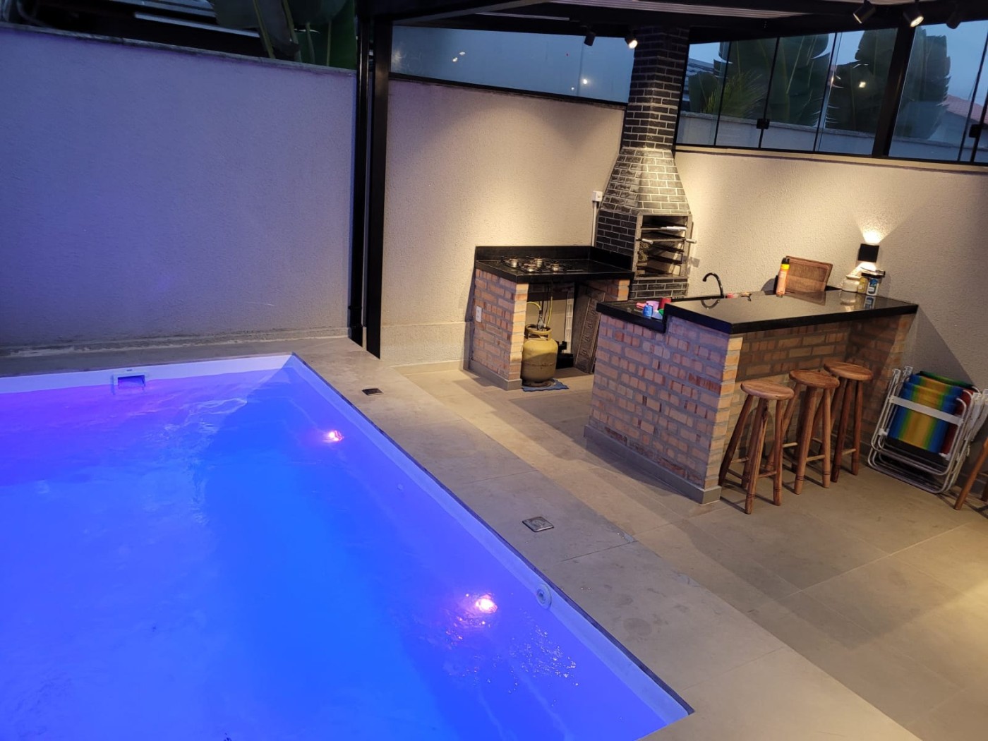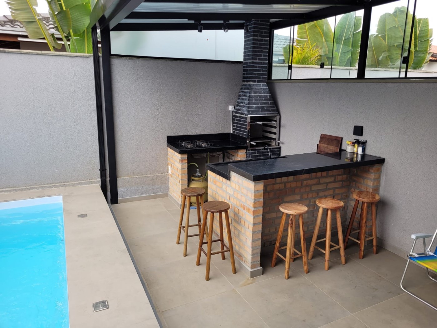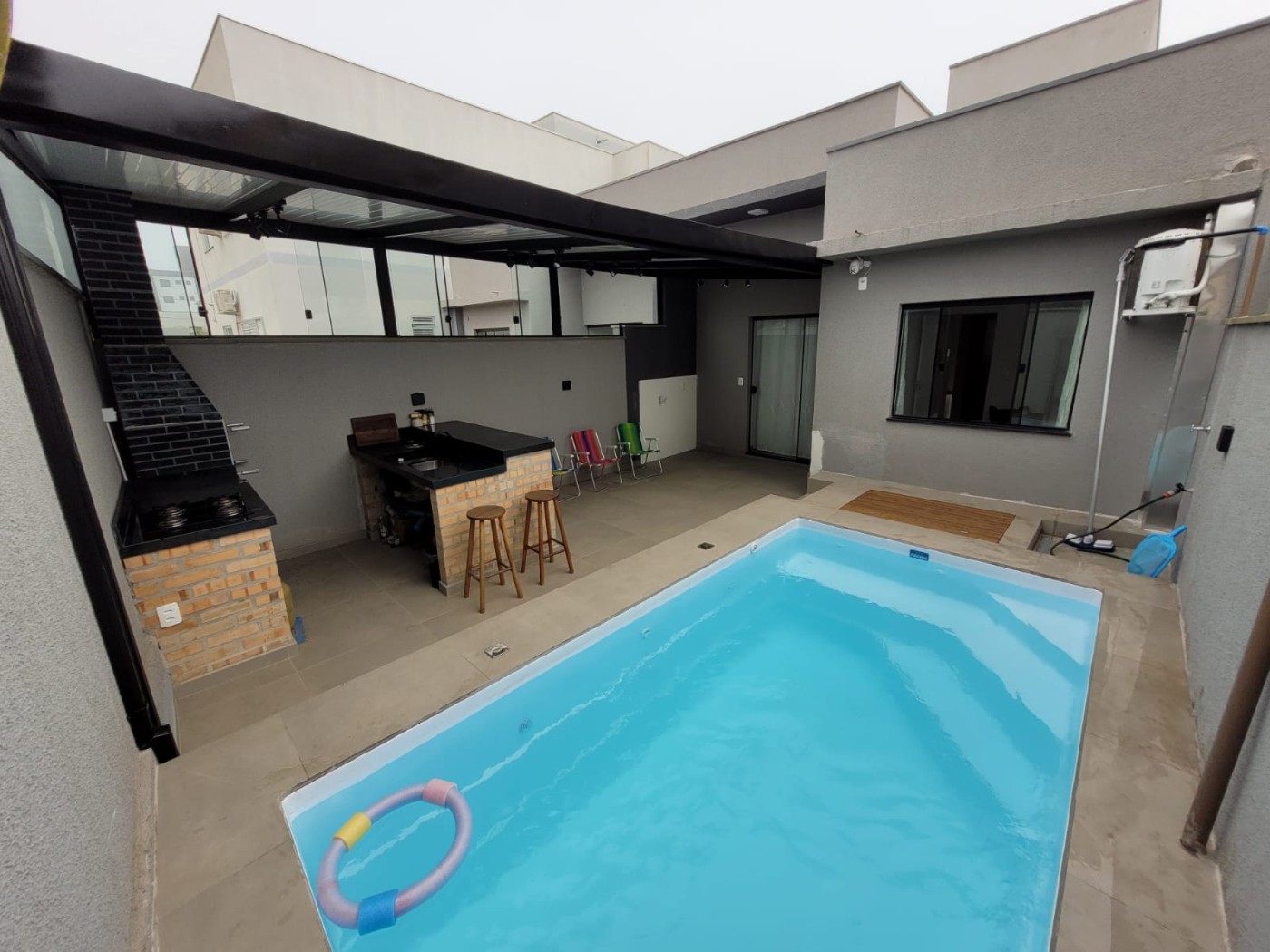 Sala e cozinha integrada, com pé direito 4metros, 02 dormitórios sendo 01 suíte, banheiro social, área de serviço, churrasqueira, amplo espaço nos fundos com área gourmet e piscina e vaga de garagem. Estrutura para segundo piso, caso tenha interesse.