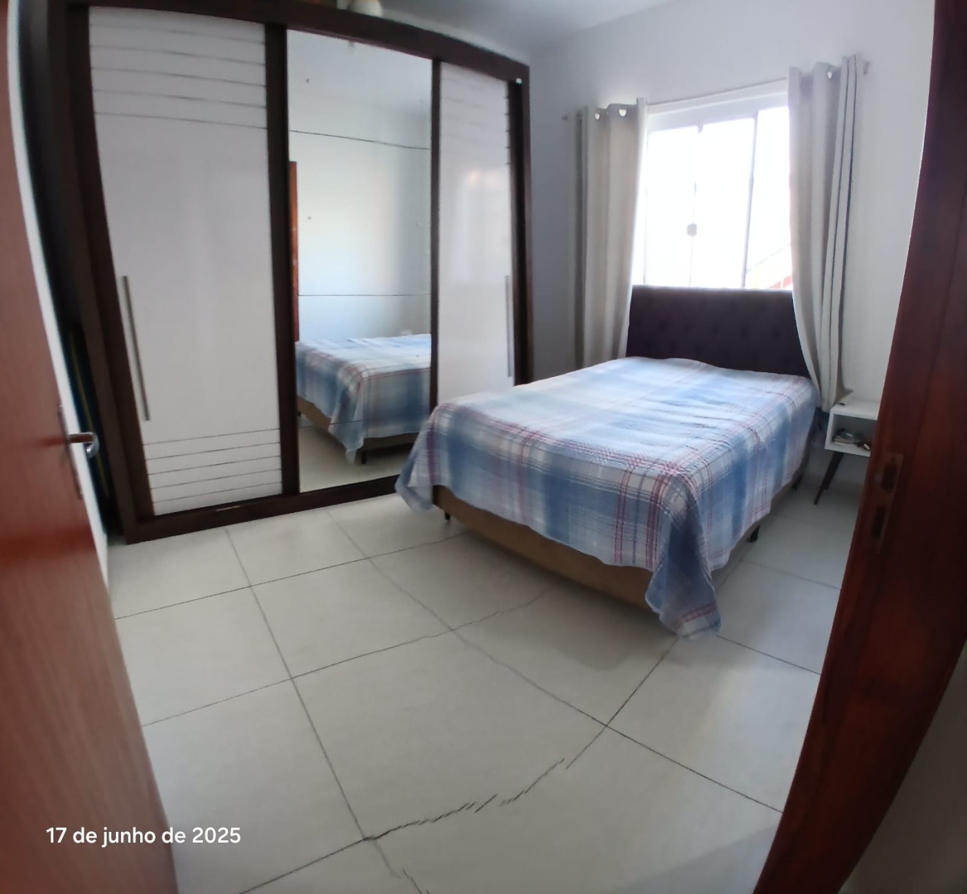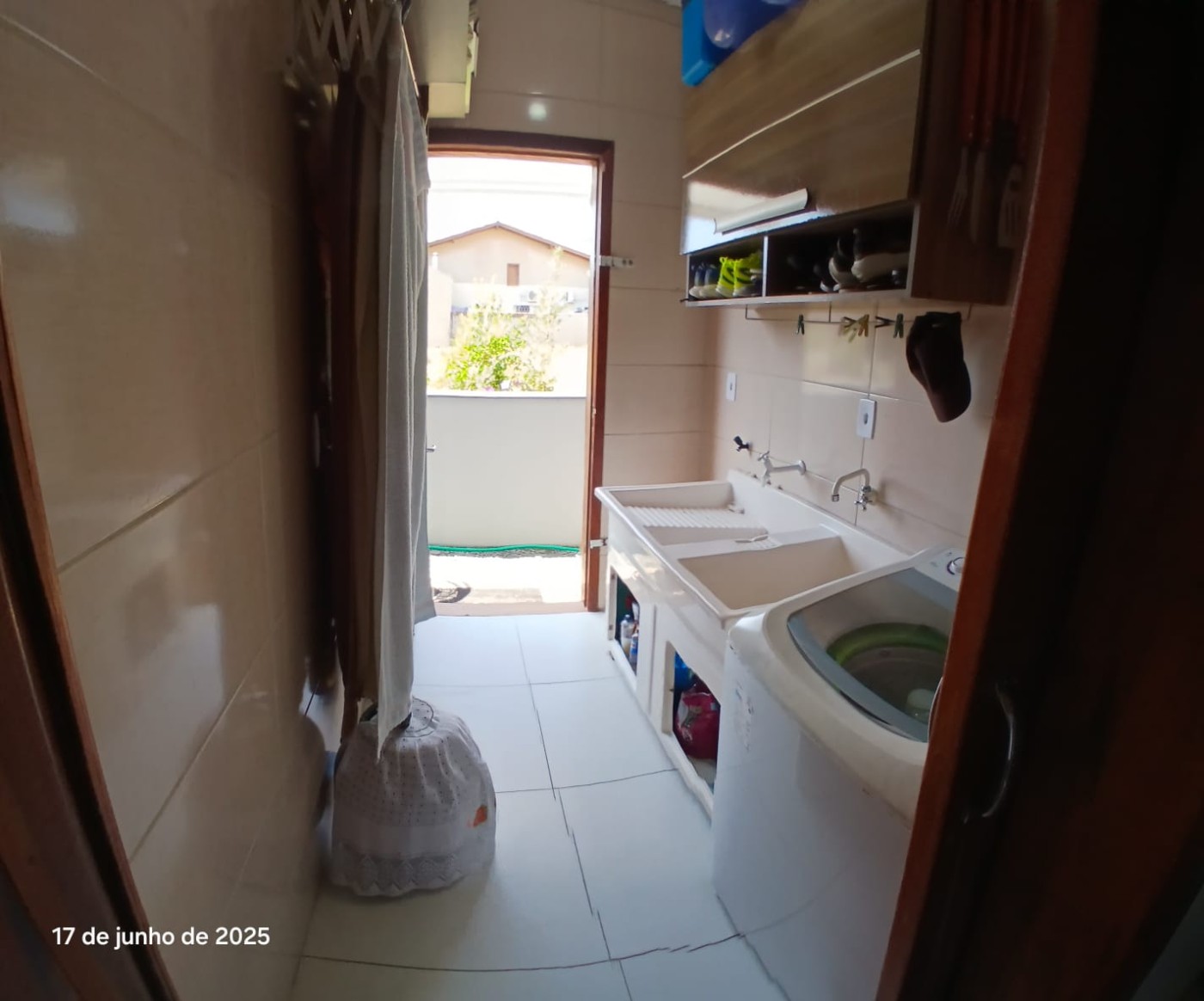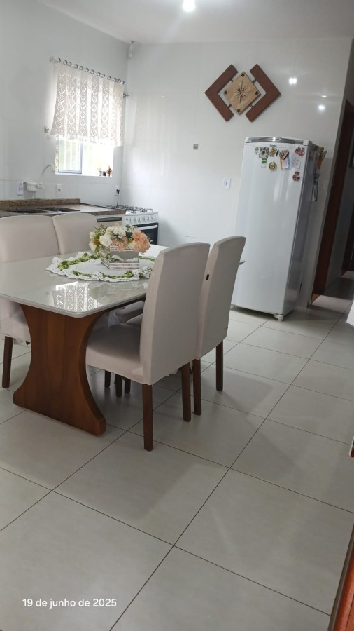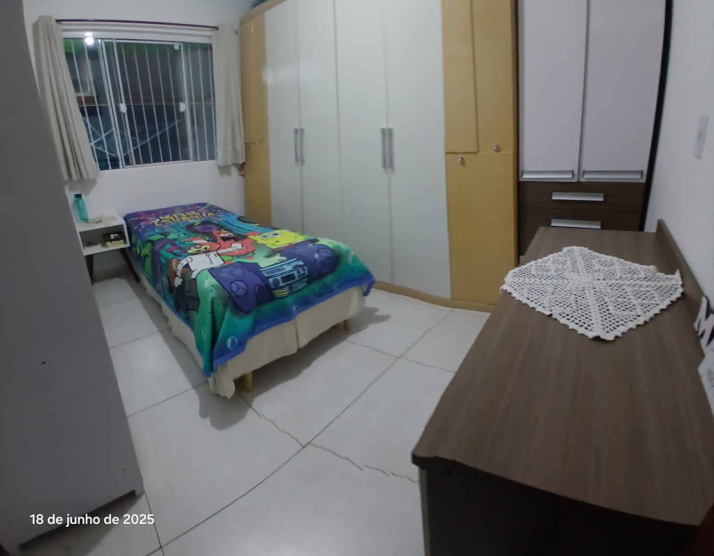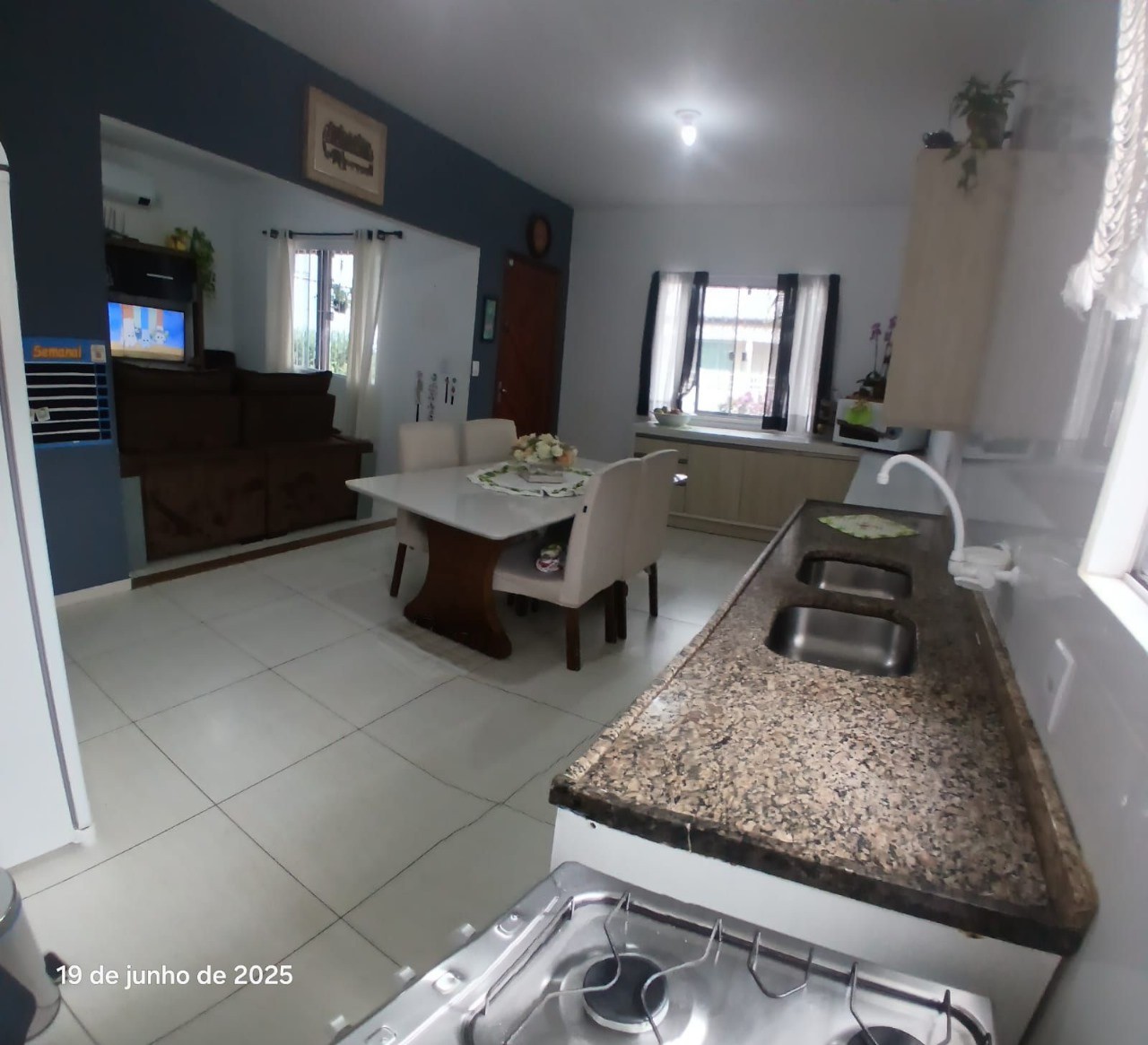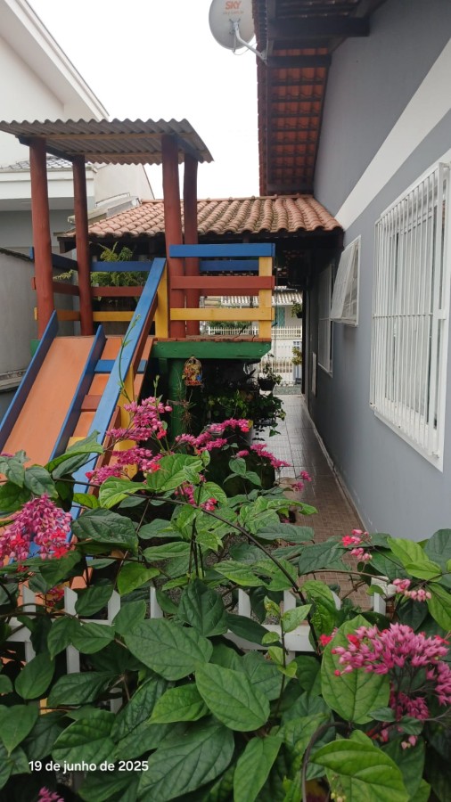Sala e cozinha integrada, 03 dormitórios sendo 01 suíte, banheiro social, área de serviço, amplo espaço nos fundos para lazer com playground de madeira, portão eletrônico, alarme, grades nas janelas e toda murada, 2 vagas de garagem coberta, casa de laje e em rua calçada.
