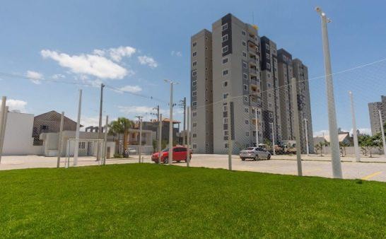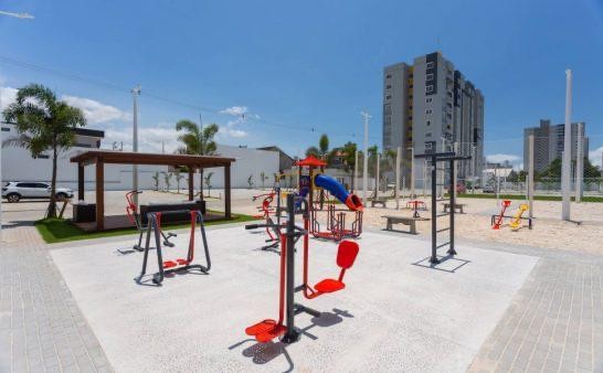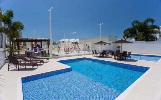 Sala e cozinha integrada, 03 dormitórios sendo 01 suíte, banheiro social e área de serviço e 02 vagas de estacionamento, 02 piscinas, Playground, Espaço Zen, Academia ao ar livre, Quadra poliesportiva.
