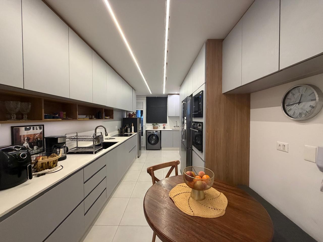 A cozinha planejada, equipada e funcional conecta-se à área de serviço, garantindo praticidade ao dia a dia sem abrir mão da elegância.