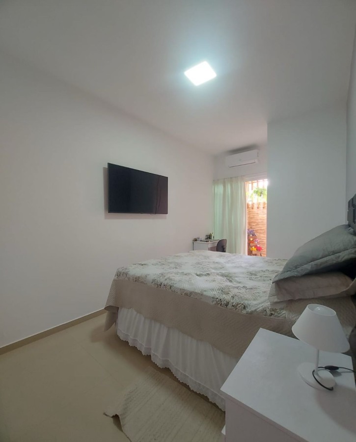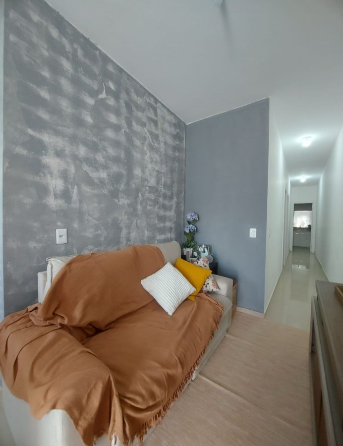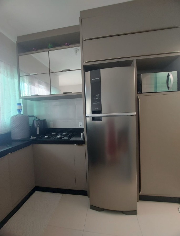 Sala e cozinha integrada (com móveis sob medida), 02 dormitórios, banheiro social, área de serviço, varanda nos fundos, 1 vaga de garagem com portão basculante com motor e em rua calçada.
