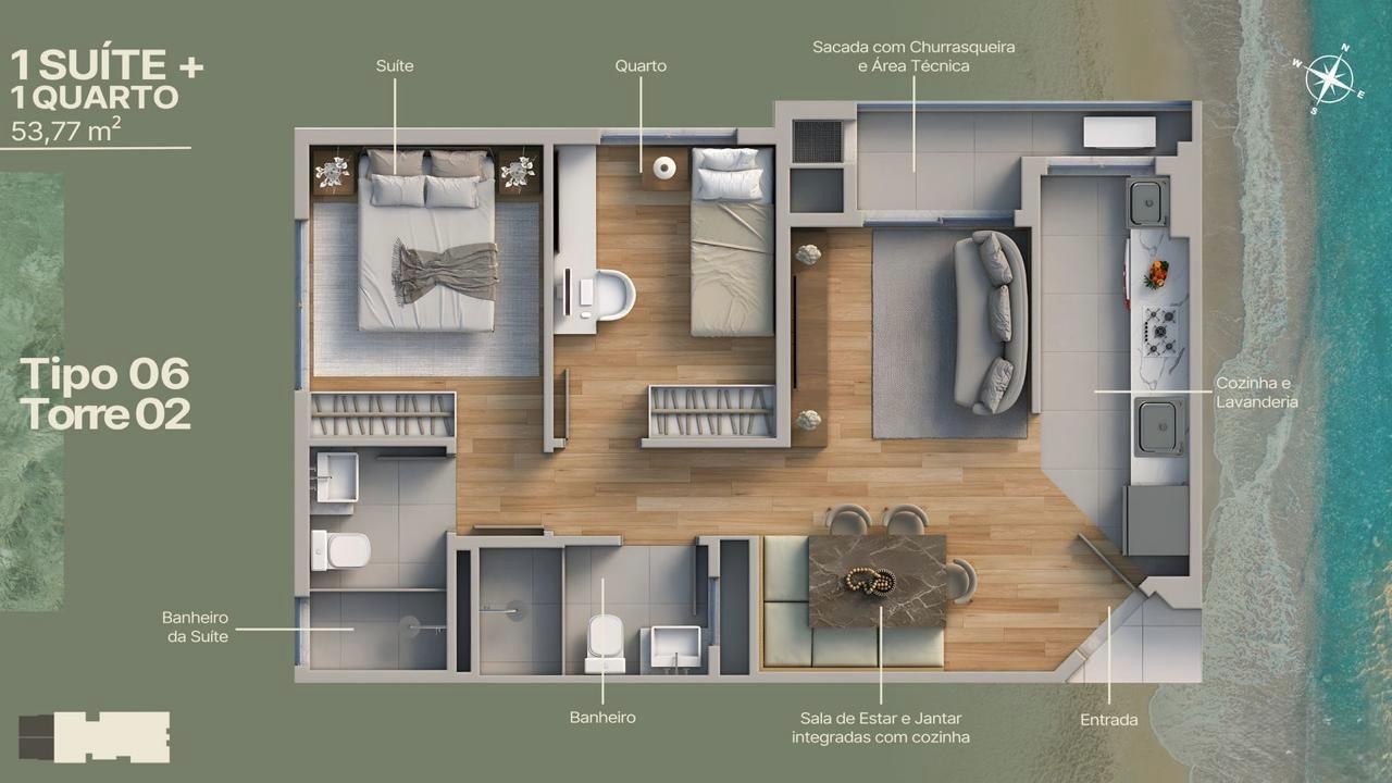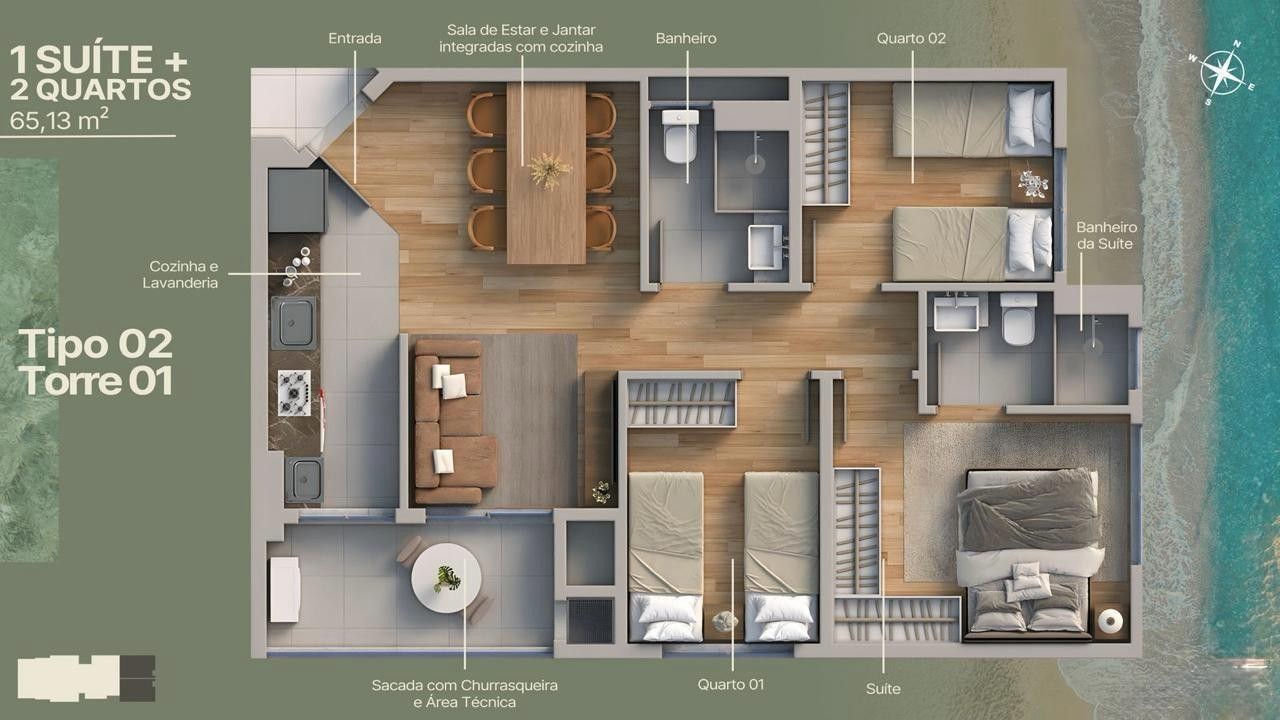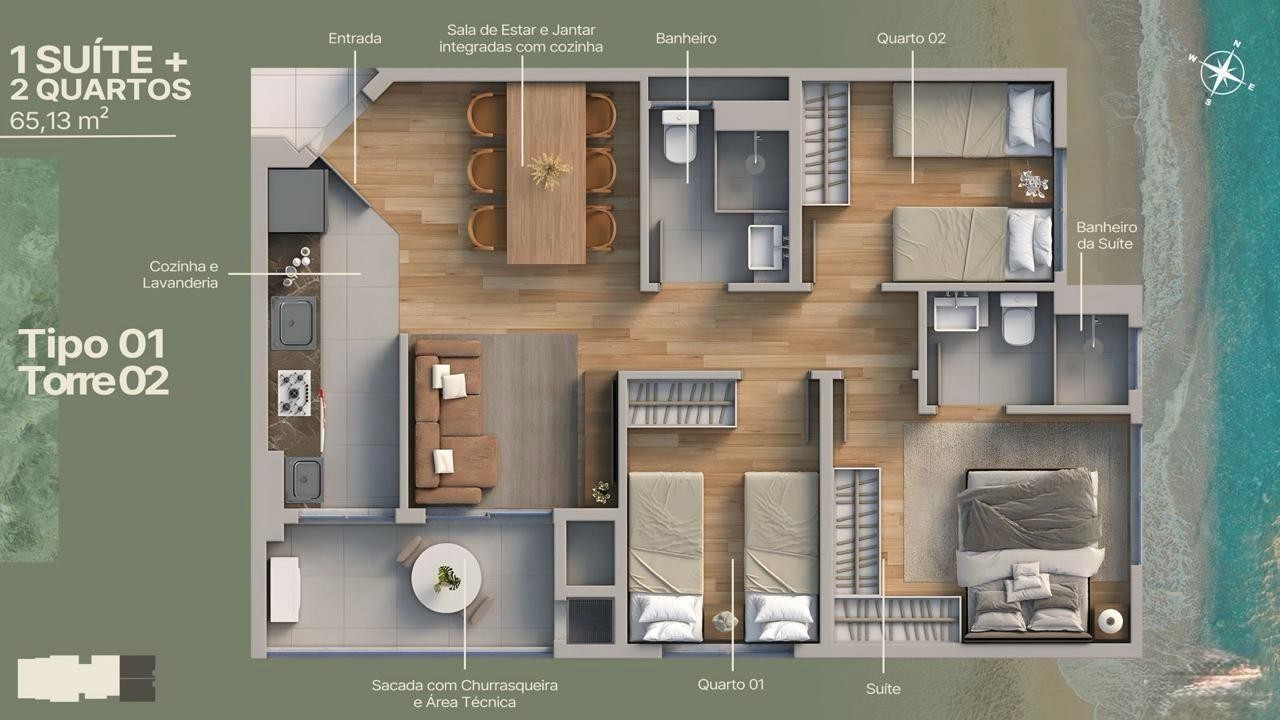 O Empreendimento possui 2 torres de 12 pavimentos com vagas cobertas e unidades de 2 e 3 quartos, de 54 a 65 m². O projeto integra living, cozinha, área de serviço e sacada com churrasqueira. Localizado no Itajuba, em Barra Velha, o empreendimento conta com elevadores, medidores individuais, captação de água, automação predial, painéis solares, pontos para veículos elétricos e acesso para PNE. A área de lazer oferece salão de festas, piscina, espaço gourmet, espaço fitness, playground, brinquedoteca, pet place, quiosque externo, solarium, piscina térmica, box de praia e entrada para banhistas. Os apartamentos incluem sala para dois ambientes, sacada técnica, banheiro social, suíte, piso cerâmico, preparo para ar-condicionado split, opções em andares altos, aceitação de pets e vistas abertas conforme a posição da unidade.
