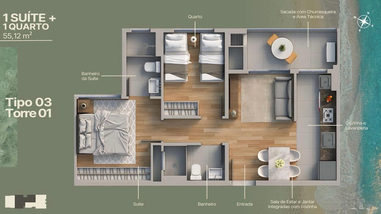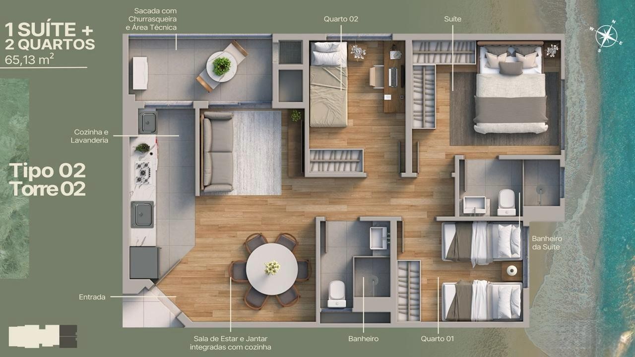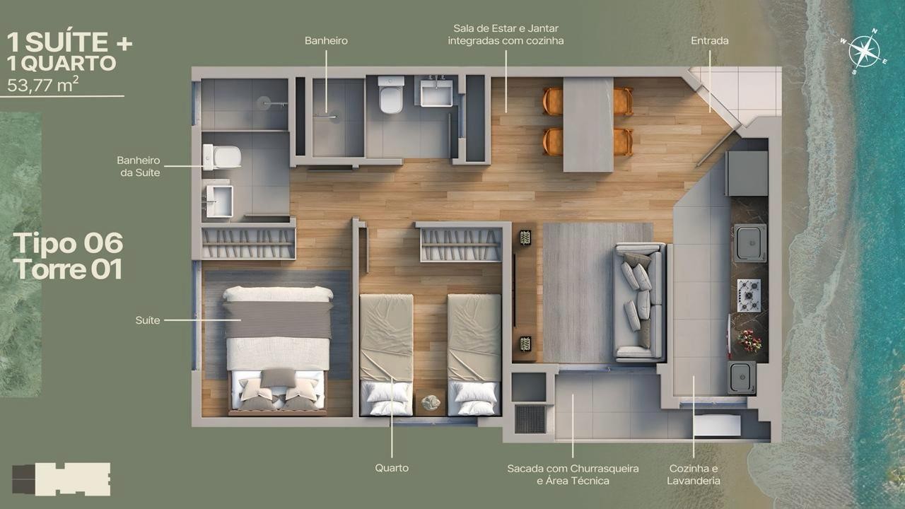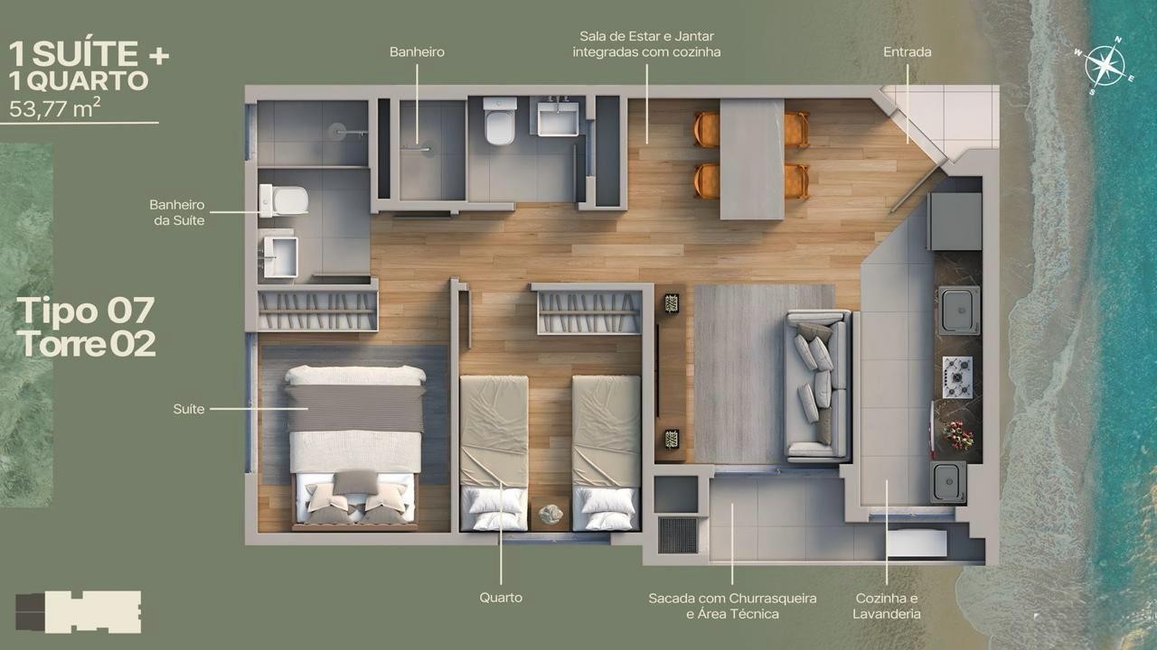 O Empreendimento possui 2 torres de 12 pavimentos com vagas cobertas e unidades de 2 e 3 quartos, de 54 a 65 m². O projeto integra living, cozinha, área de serviço e sacada com churrasqueira. Localizado no Itajuba, em Barra Velha, o empreendimento conta com elevadores, medidores individuais, captação de água, automação predial, painéis solares, pontos para veículos elétricos e acesso para PNE. A área de lazer oferece salão de festas, piscina, espaço gourmet, espaço fitness, playground, brinquedoteca, pet place, quiosque externo, solarium, piscina térmica, box de praia e entrada para banhistas. Os apartamentos incluem sala para dois ambientes, sacada técnica, banheiro social, suíte, piso cerâmico, preparo para ar-condicionado split, opções em andares altos, aceitação de pets e vistas abertas conforme a posição da unidade.