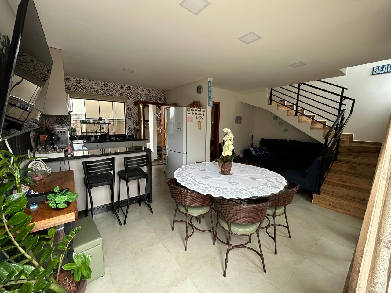 Sala e cozinha integrada, 03 dormitórios sendo 01 suíte, banheiro social, área de serviço externa, piscina na frente e 3 vagas de garagem coberta. Excelente acabamento, 8 placas solares, espaço gourmet com churrasqueira e portão eletrônico e em rua calçada.