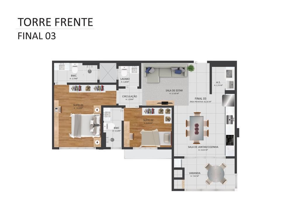 O apartamento no 12 andar de 82,56m2 metros, 02 suítes, 02 vagas de garagem, living integrado, varanda gourmet para se deliciar com um churrasco entre família e amigos. Além de uma área de lazer completa, com piscina, cinema e muito mais.