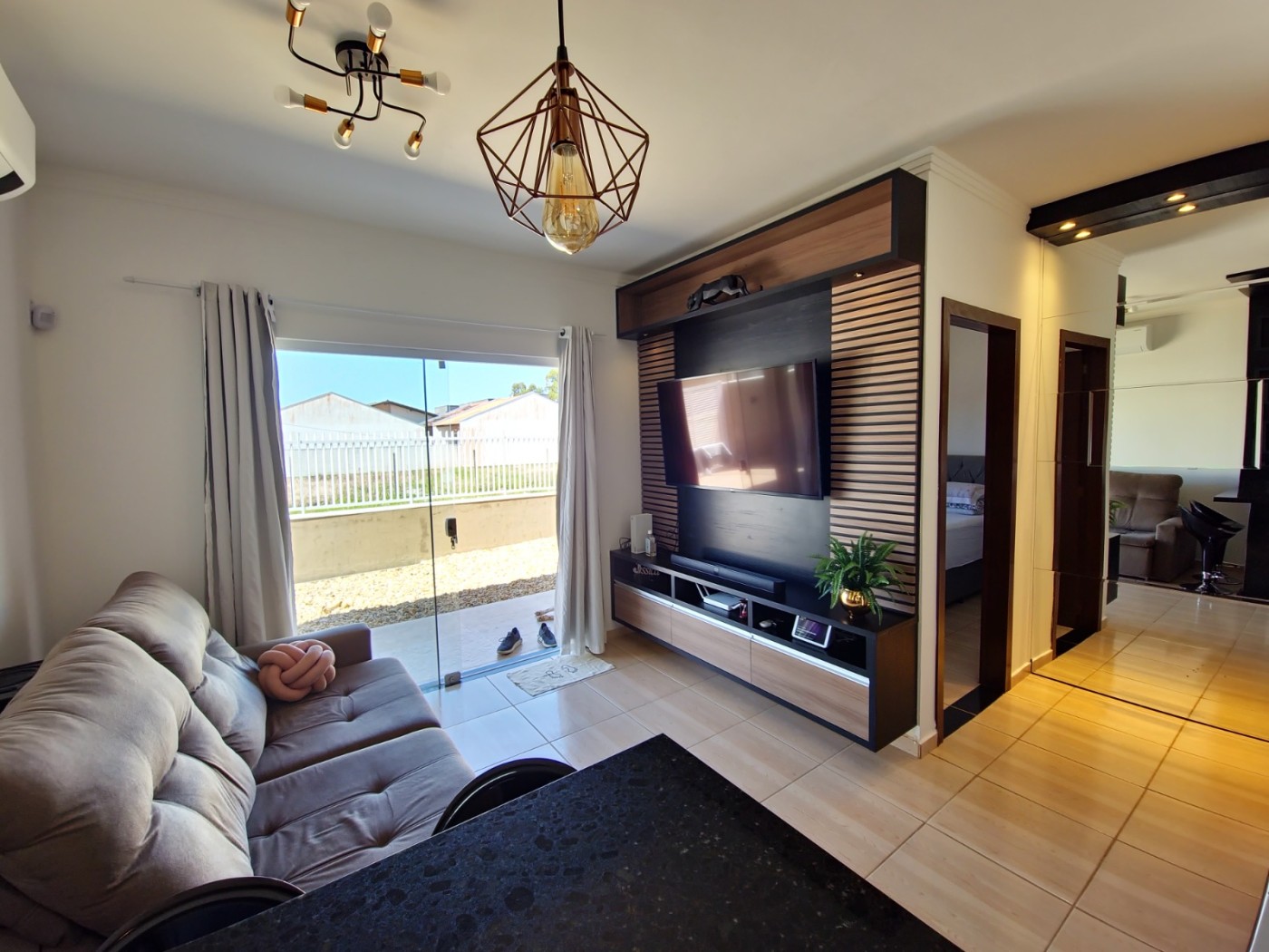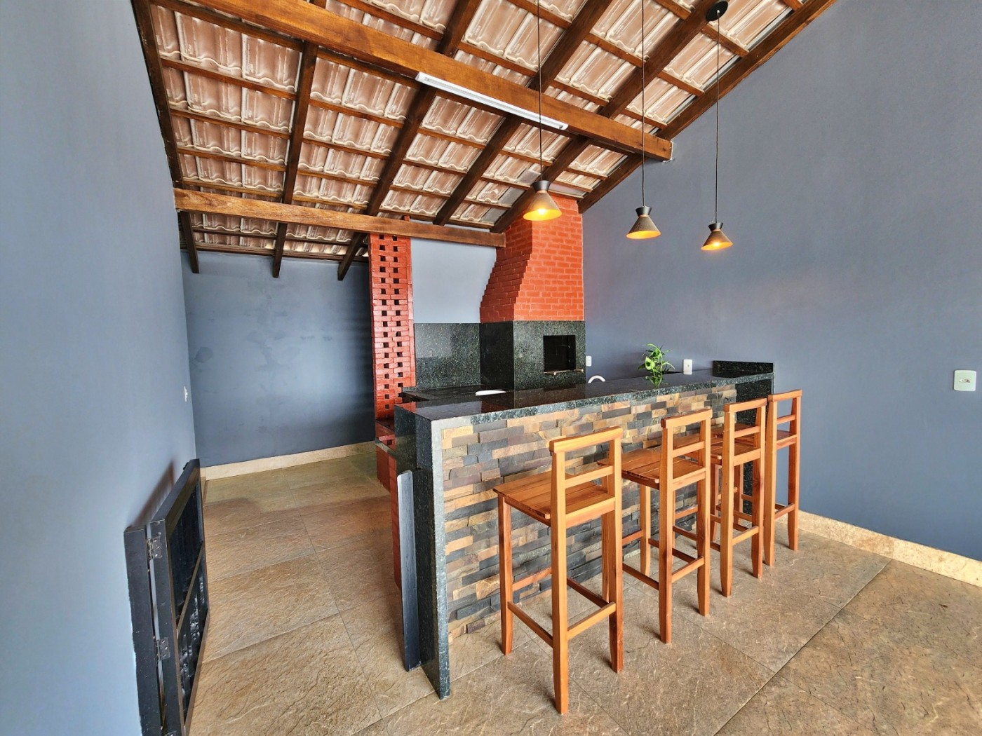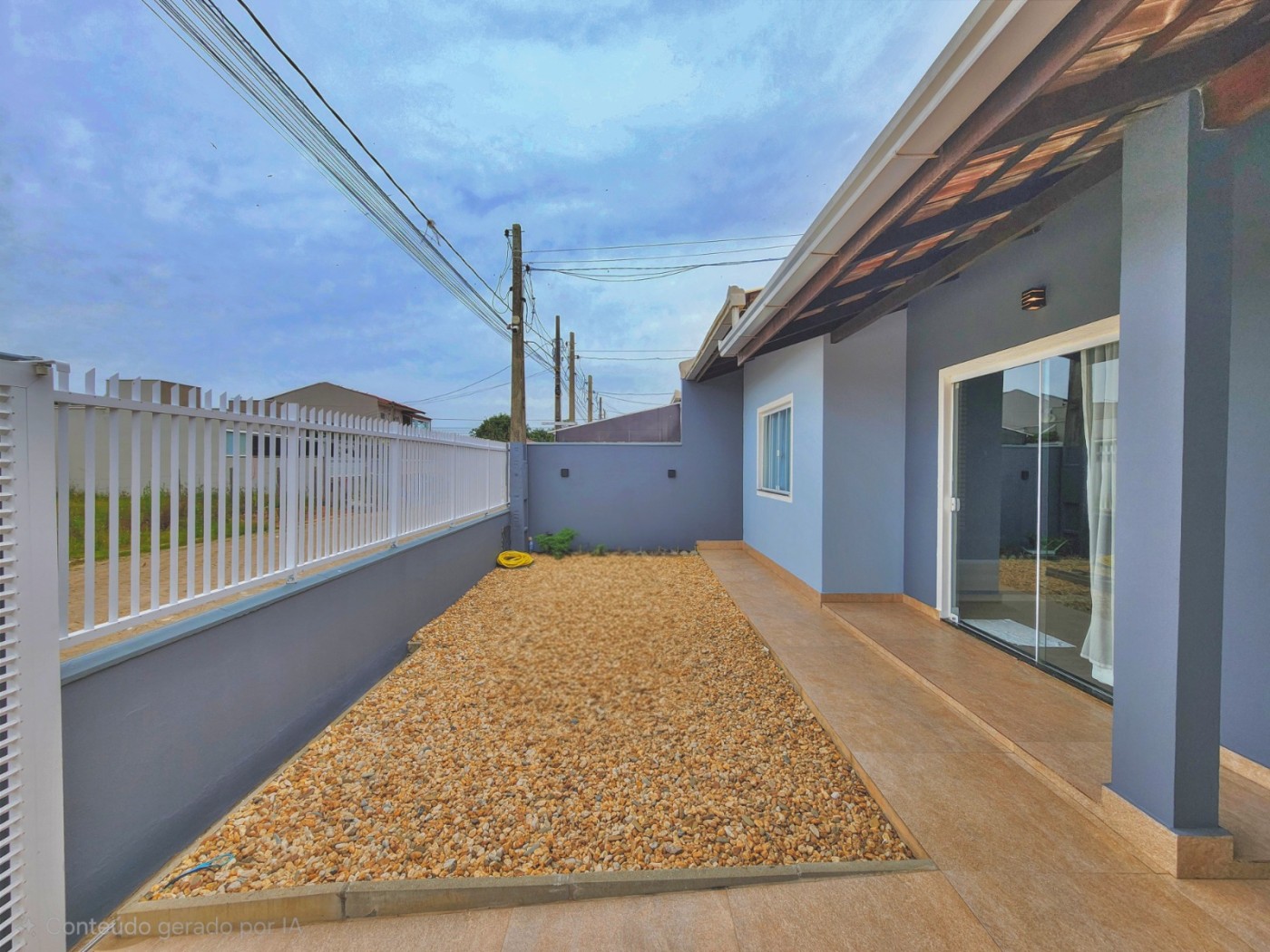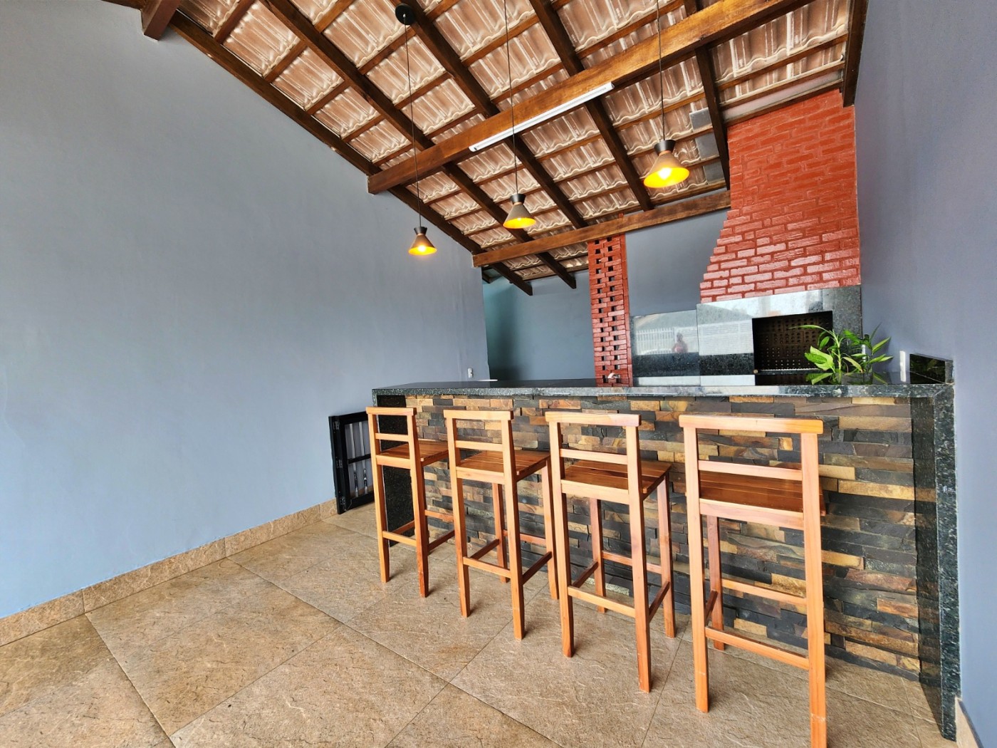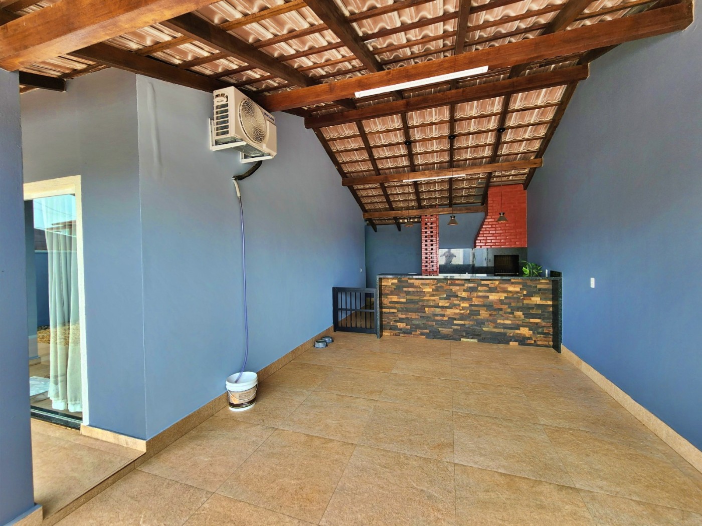 Sala ampla e cozinha integrada, 02 dormitórios sendo 01 suíte, banheiro social, área de serviço coberta, ampla área de festas com fogão a lenha, churrasqueira a carvão e bancada com vaga de garagem coberta.