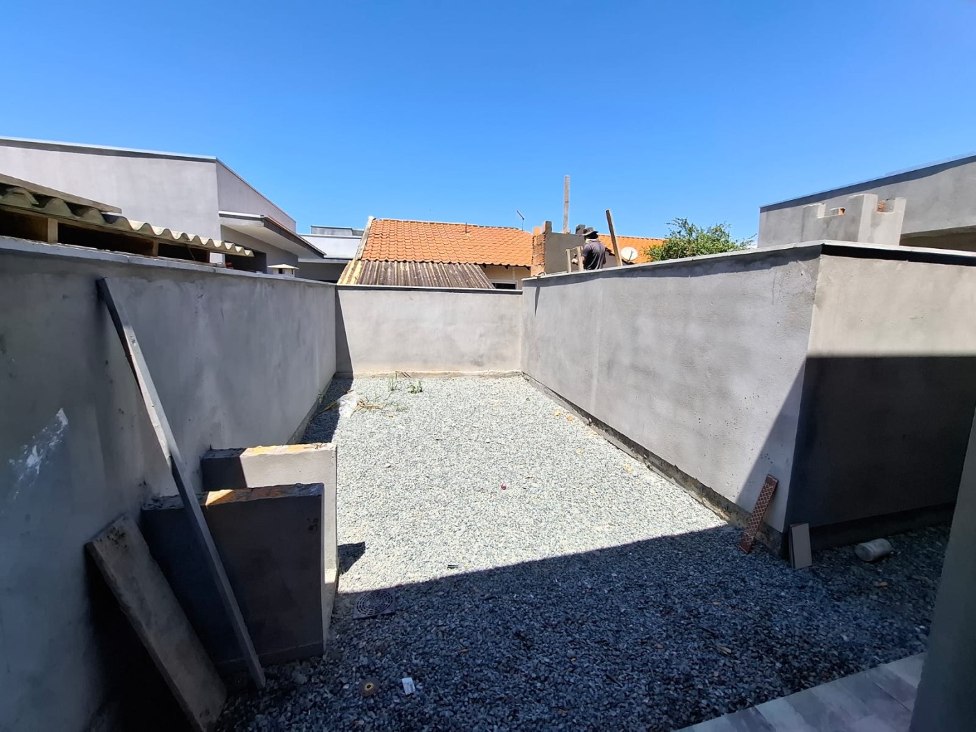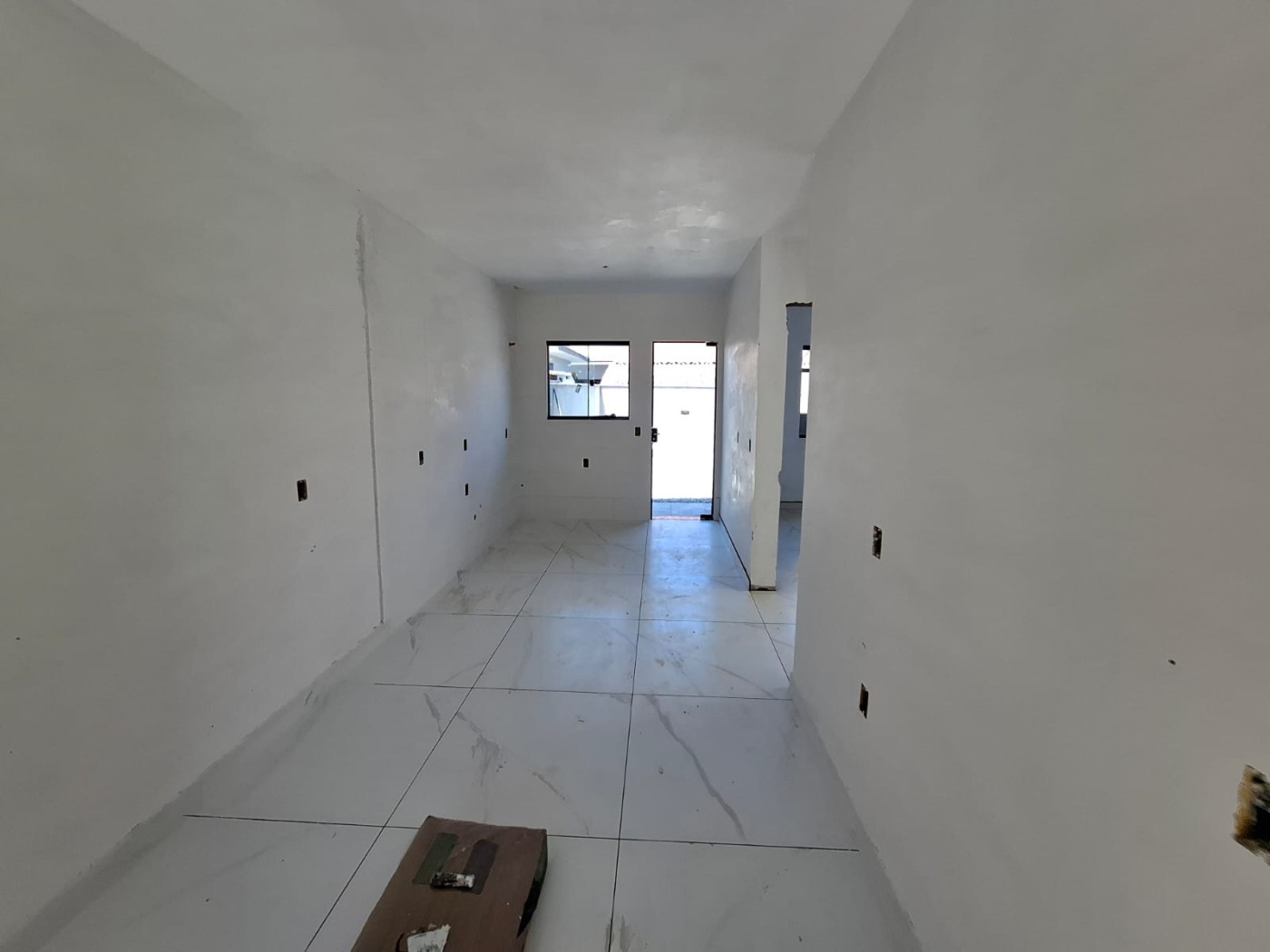 Sala e cozinha integrada, 02 dormitórios, banheiro social, área de serviço, churrasqueira, espaço nos fundos para lazer e 1 vaga de garagem.