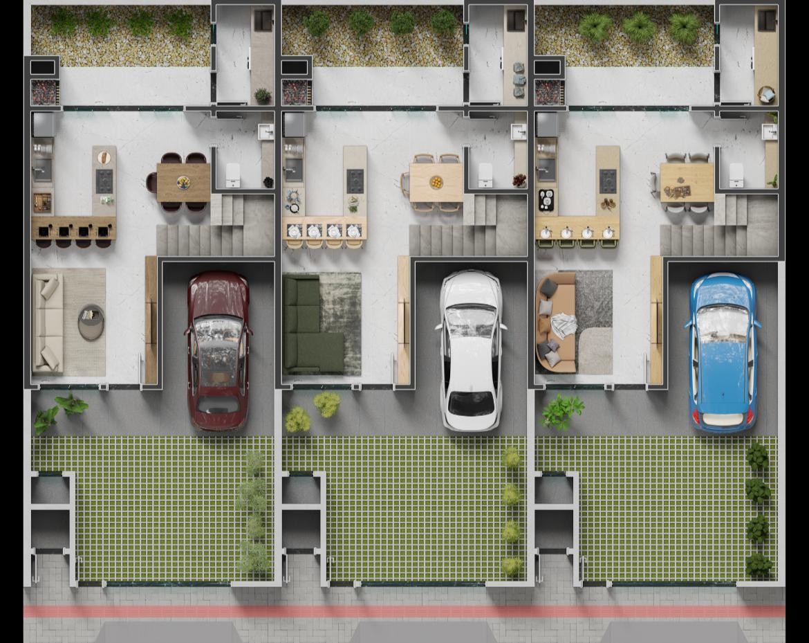 Sala e cozinha integrada, 03 dormitórios sendo 01 suíte, banheiro social, área de serviço, churrasqueira, espaço nos fundos para lazer, 2 vagas de garagem (sendo uma coberta) em rua calçada.