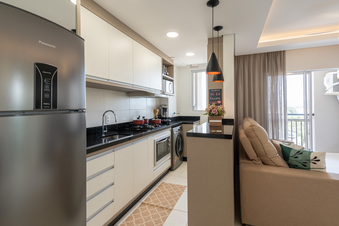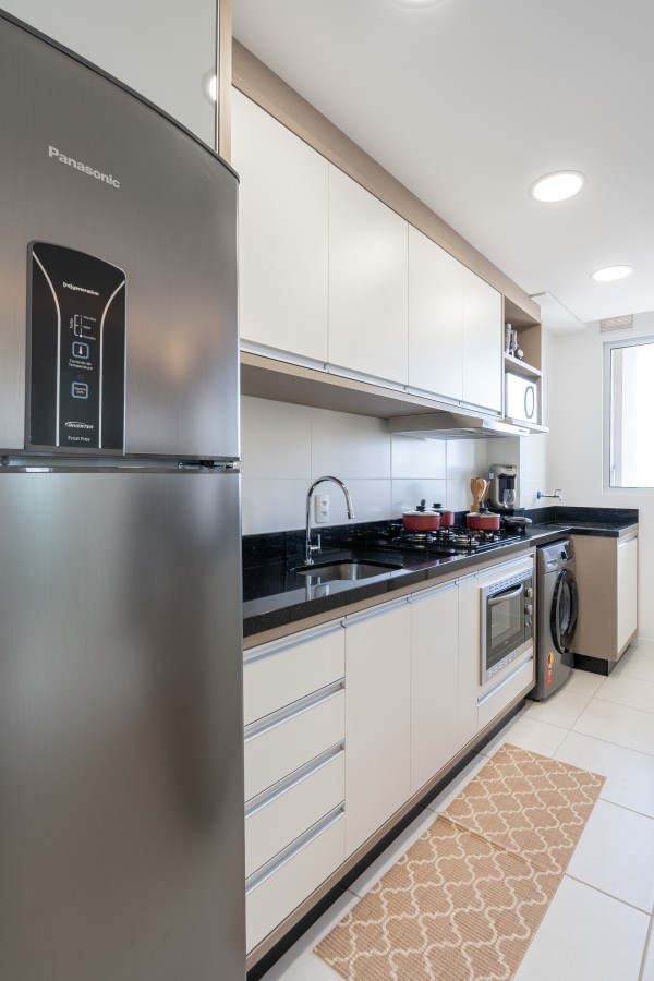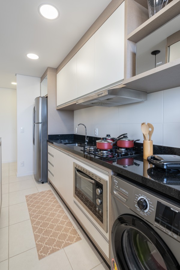 - 1 cozinha contendo eletrodomésticos (fogão, forno elétrico embutido, exaustor, micro-ondas, filtro de água, batedeira, liquidificador, airfryer e liquidificador).