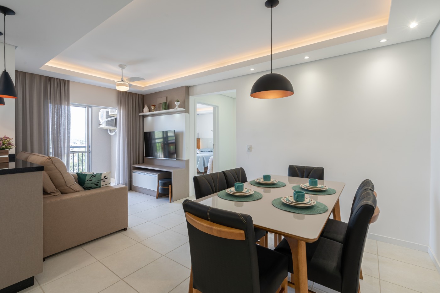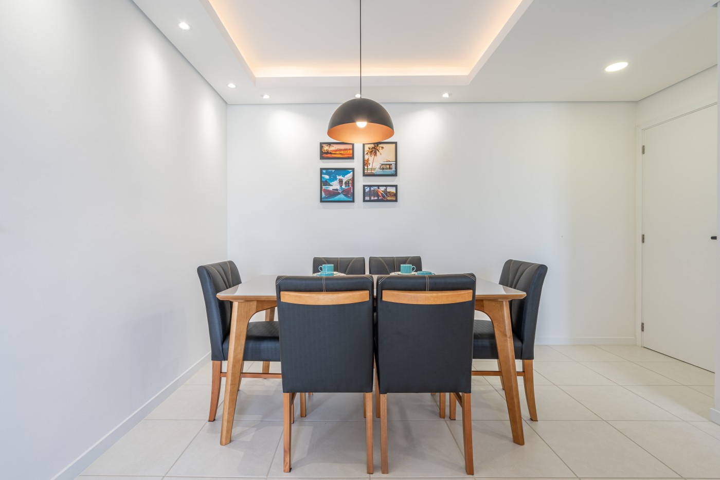 - 1 sala de jala de jantar contendo um jogo de mesa com 6 cadeiras e decorações. Um balcão de passa pratos com um armário embaixo embutido.