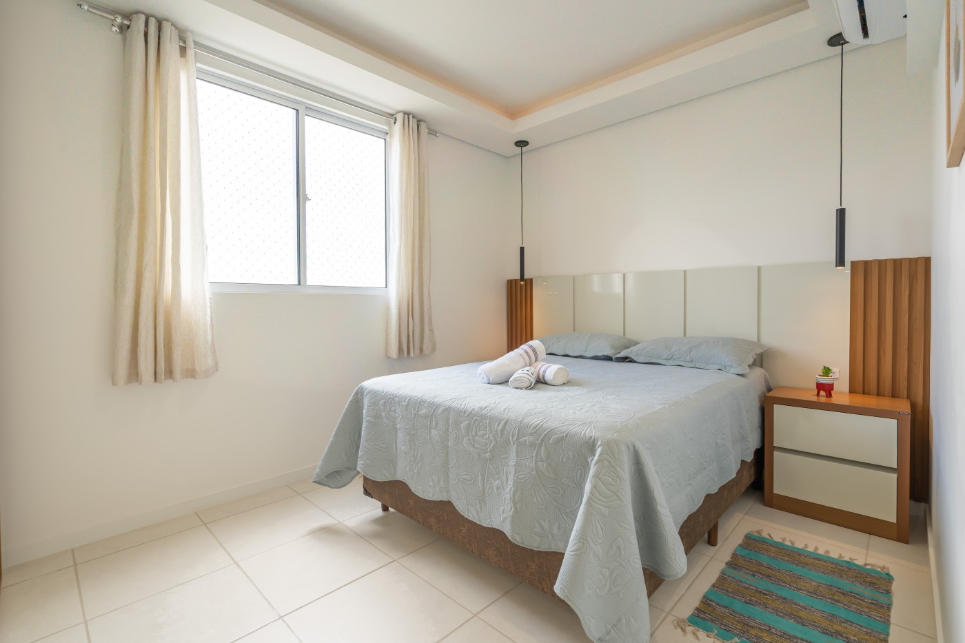 - 2 quartos, sendo um de casal e um de solteiro (ambos com camas e guarda-roupas e decorações);