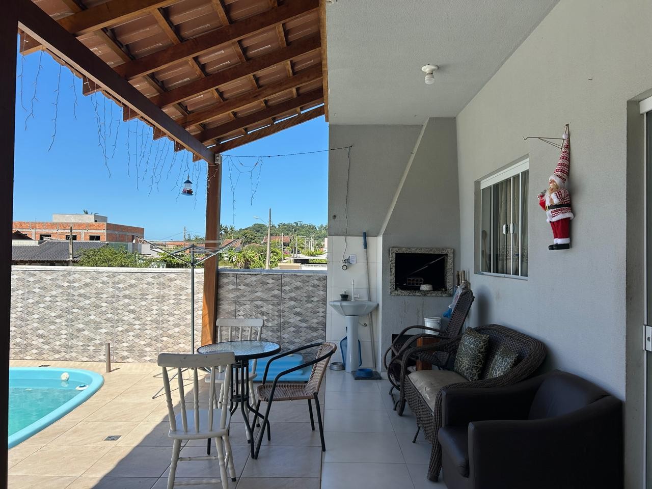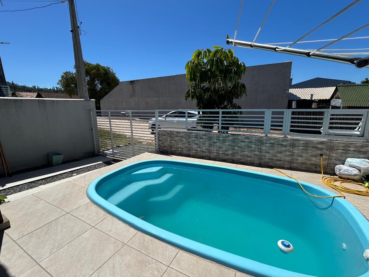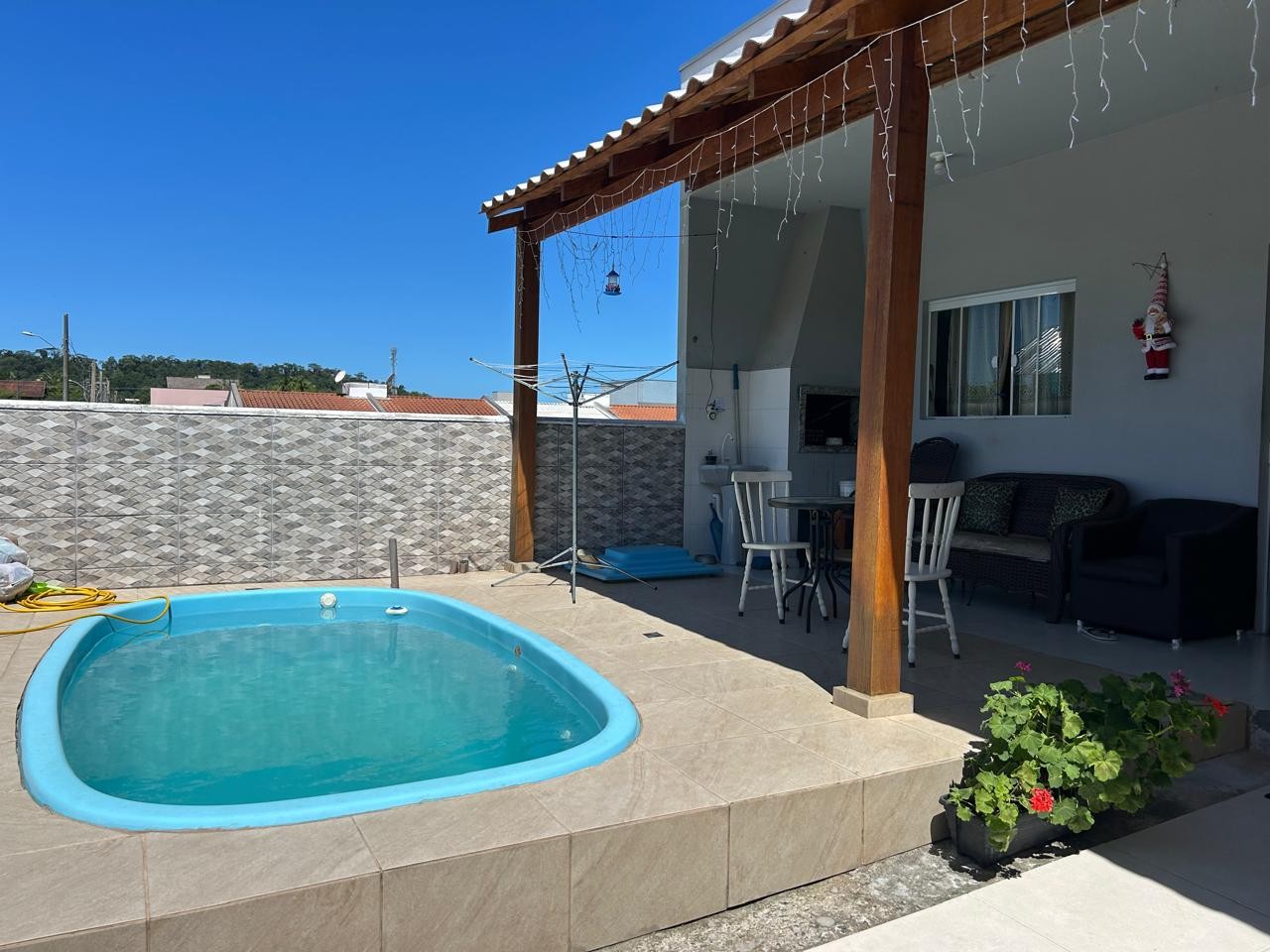 Sala e cozinha integrada, 03 dormitórios, sendo 1 suíte, banheiro social, área de serviço, piscina e vaga de garagem coberta.