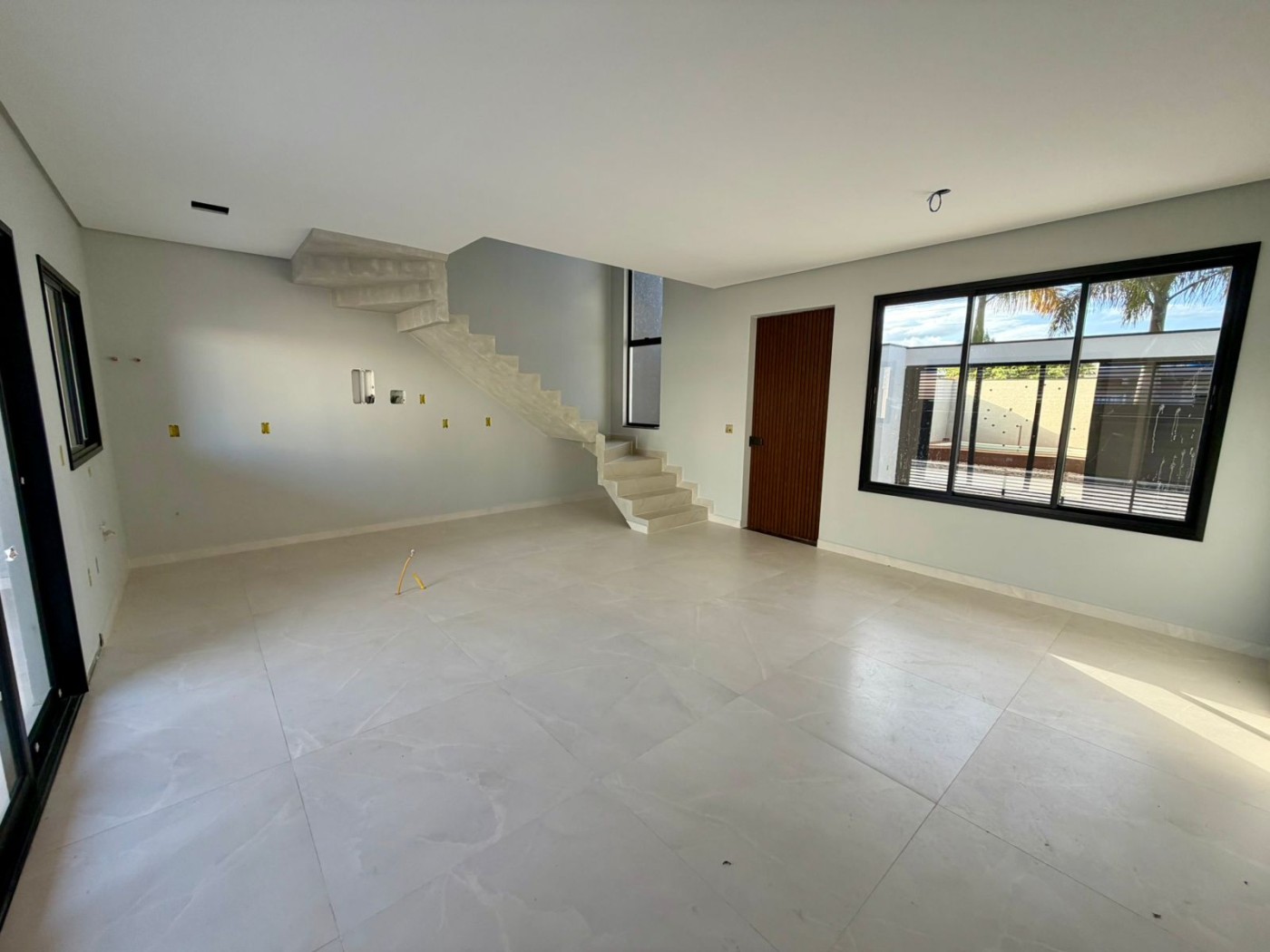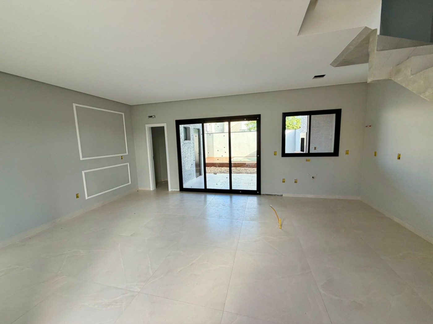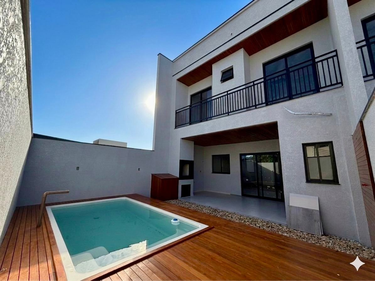 Sala e cozinha integrada, 03 dormitórios sendo 01 suíte, 2 banheiros social, área de serviço coberta, sistema a gás para chuveiros e cozinha, infra de ar condicionado em todos os cômodos, espaço na lateral da área externa com piscina e 2 vagas de garagem.